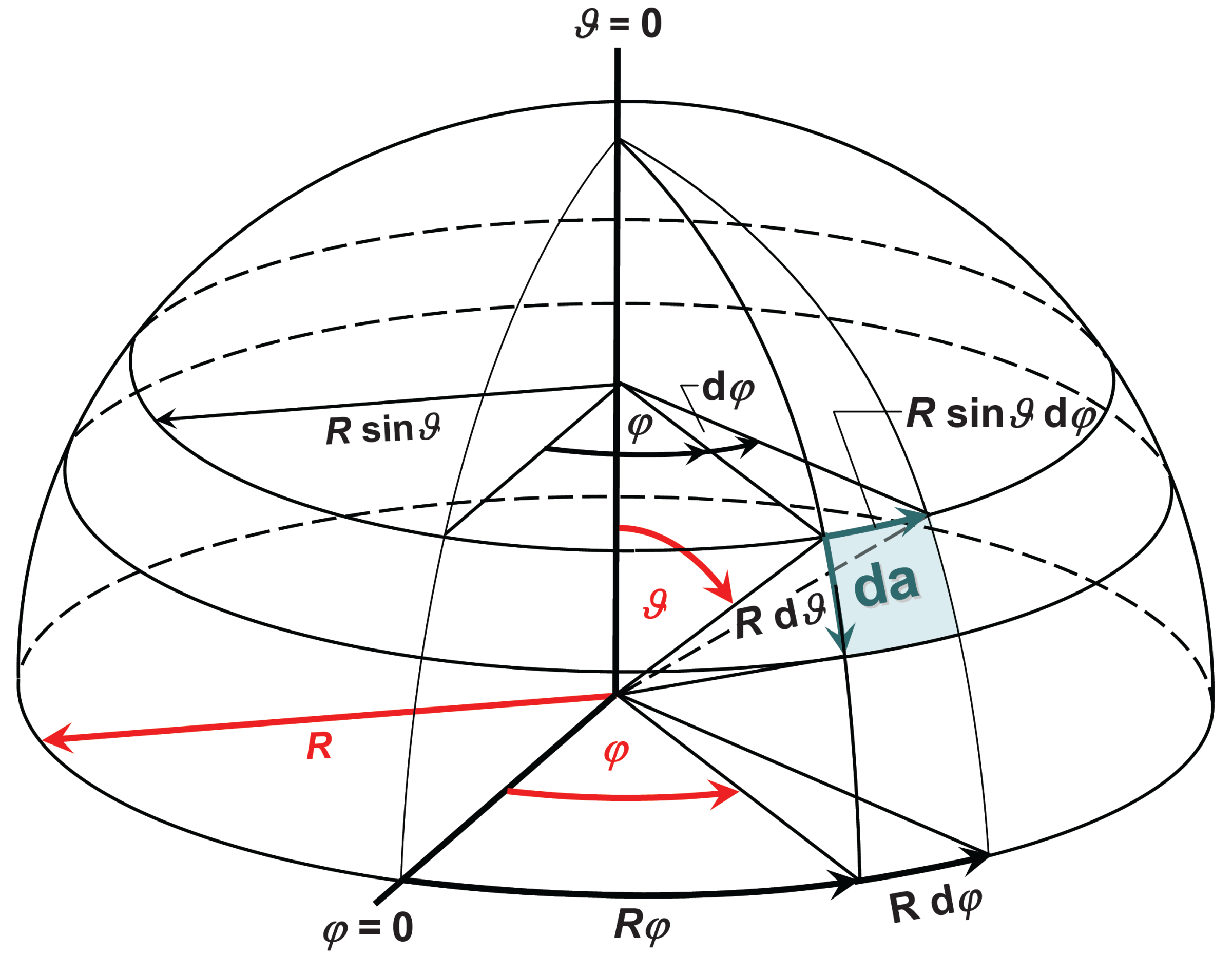 Die folgende Grafik zeigt einen aus der Fläche da im Abstand R vom Koordinatenursprung gebildeten differenziellen Raumwinkel