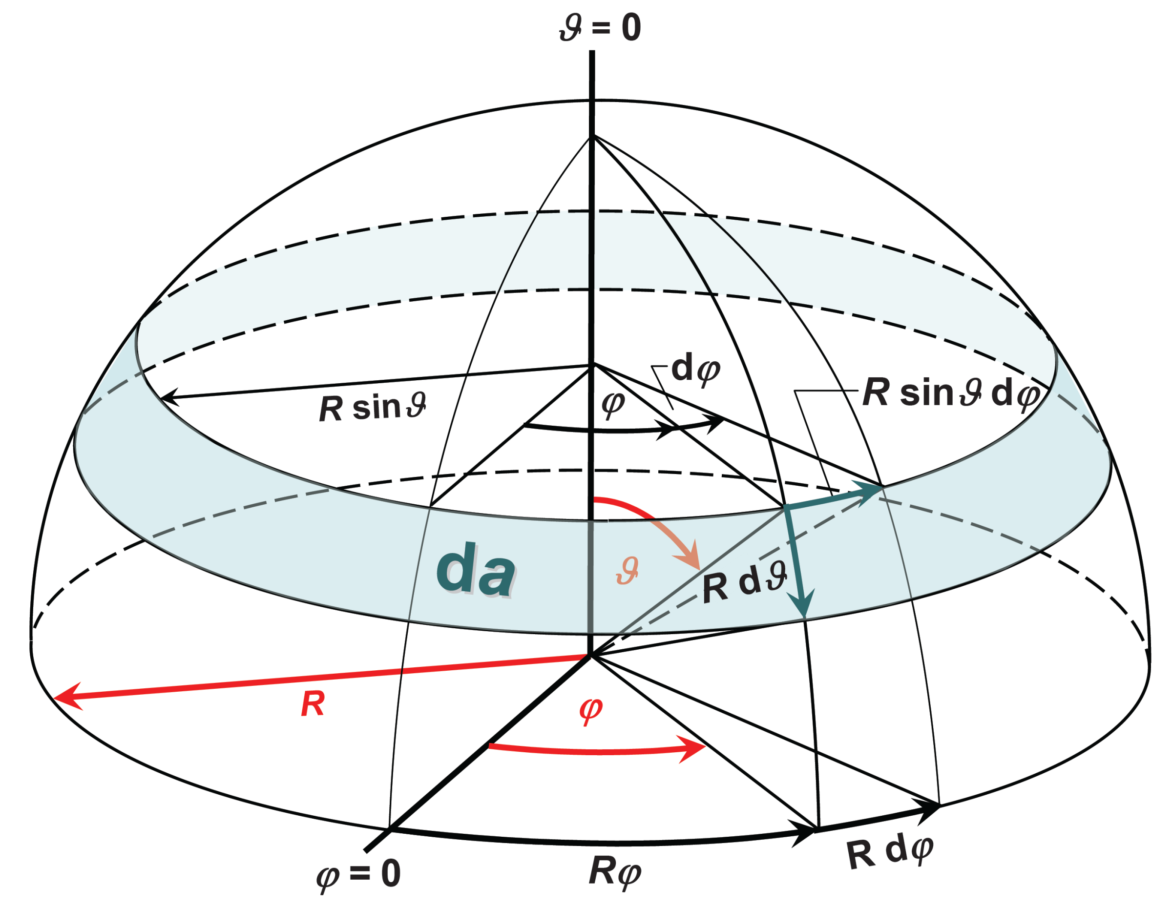 Bei anisotropen Strahlern, deren Emission symmetrisch um eine Achse ist, kann das Integral teilweise gelöst werden. Hierfür betrachten wir die folgende Grafik, in der ein axialsymmetrischer Raumwinkel um die Vertikalachse (die Zenitachse) dargestellt ist und wie ein um die Halbkugel gelegtes Band erscheint. Dieser ebenfalls differenzielle Raumwinkel ist:
