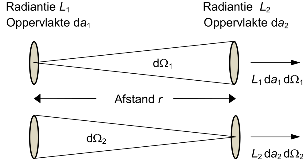 De radiantie kenmerkt het stralingsvermogen dat door het oppervlak in deze ruimtehoek wordt uitgestraald: