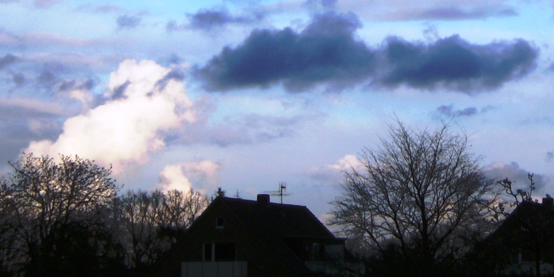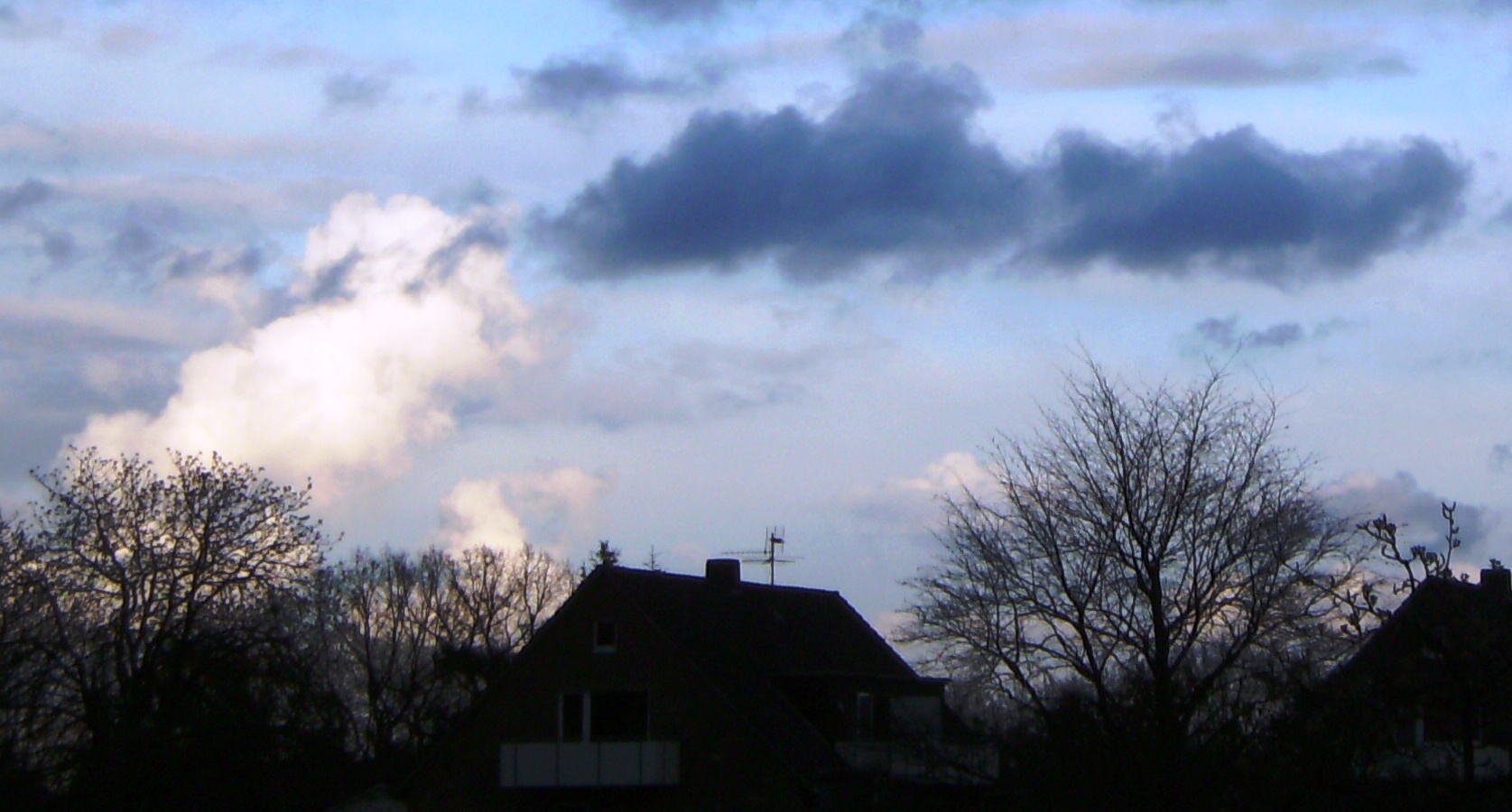 Auch dunkle Cumulonimbus-Wolken können Kosinus-Streuer sein: ihre Dichte der Tröpfchen ist so hoch dass sehr viel Licht von der bestrahlten Oberseite bis zur Unterseite durch Absorption verloren geht. Im Foto sieht man auch weiße Cumulus-Wolken, die Kosinus-Streuer sind. Höher liegende teiltransparente Wolken sind durch das abendliche Sonnenlicht rötlich gefärbt und zeigen keine gute Kosinus-Charakteristik.