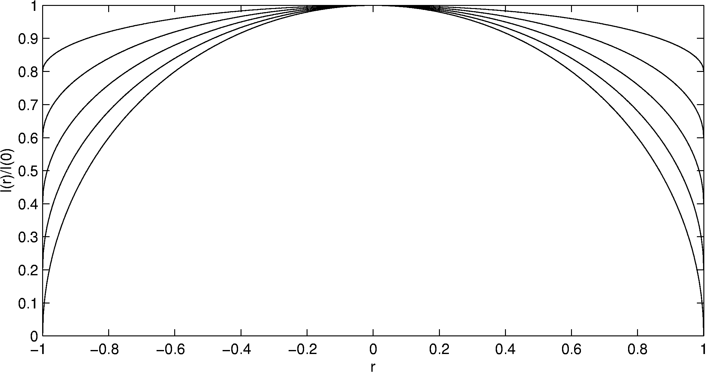 Der Parameter u ist der Randverdunkelungskoeffizient, mit Werten von 0,56 bei 600 nm (orange) und 0,95 bei 320 nm (UV). a ist der Radius der Sonnenscheibe. Setzt man a=1 und normiert den Mittenabstand r auf den Maximalwert 1, ergeben sich die folgenden Kurven.