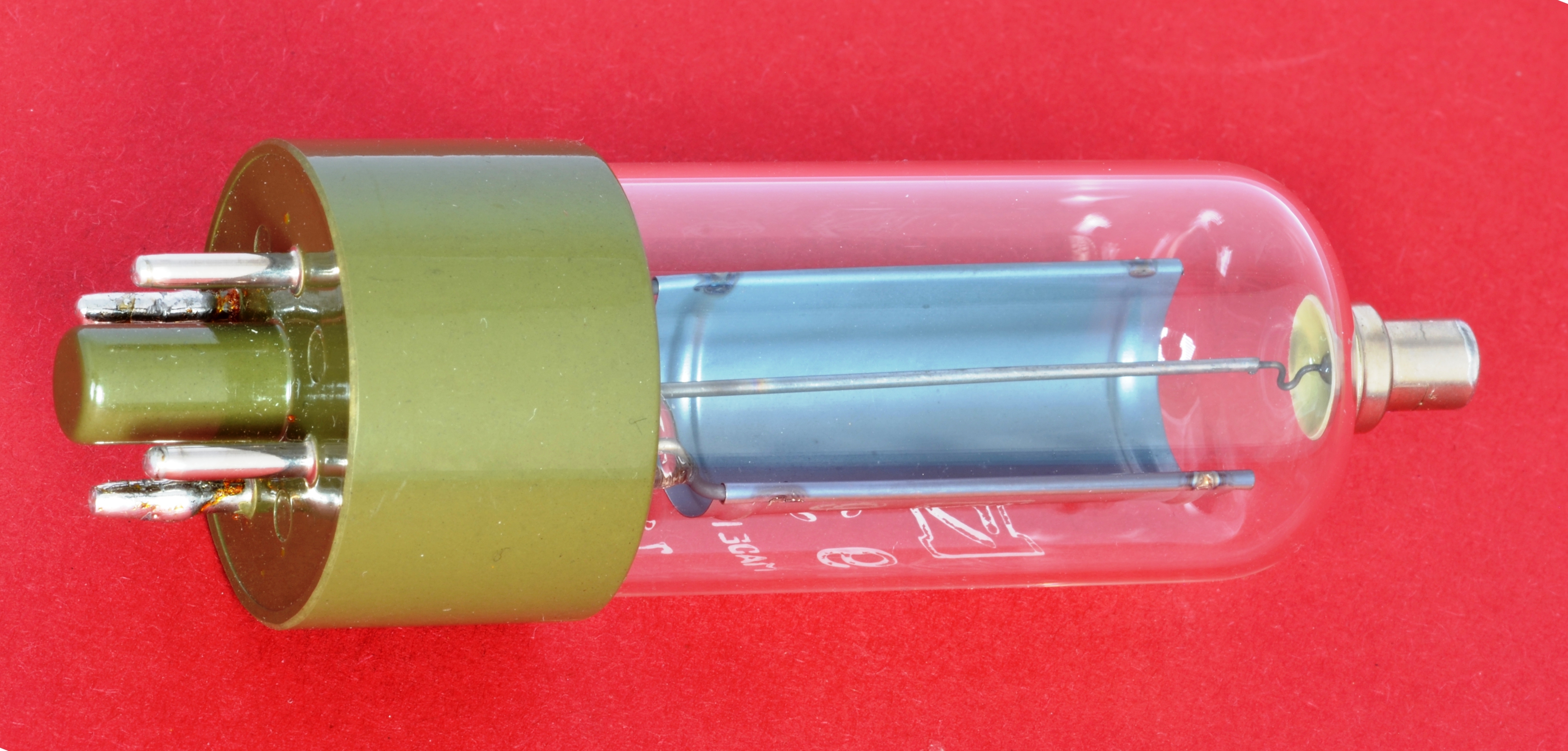 These detectors, also known as vacuum photocells, consist of a photocathode and an anode arranged in an evacuated glass tube. The electrons released from the photocathode by radiation are accelerated to the anode by an externally applied voltage of approx. 10 to 100 V and absorbed by the anode. This is known as the photocurrent. It should not exceed approximately 10 µA, as otherwise the proportionality between the photocurrent and the irradiance, i.e. the linearity of the detector, may be lost.