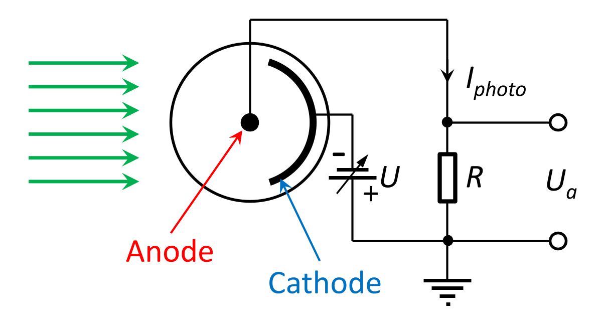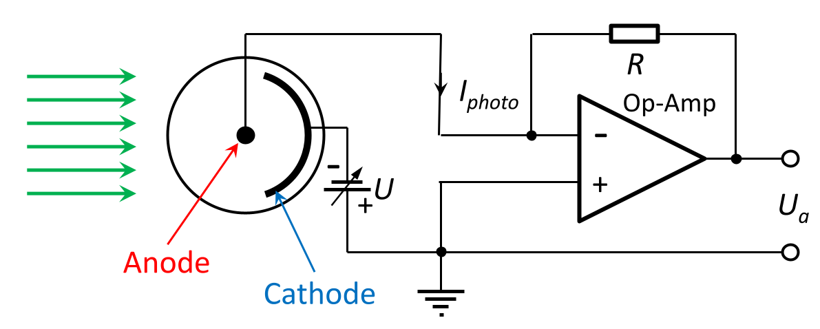 The diagram on the right shows the circuitry of a photodiode. A voltage U, which can be adjusted in height, ensures that the electrons released from the cathode by the light (green arrows) are accelerated towards the anode. The photocurrent Iphoto flowing through the resistor R generates a negative output voltage Ua=-R·Iphoto. The direction arrow on Iphoto indicates the direction of the electron current, which is opposite to the technical direction of current. Instead of the resistor, an ammeter with a measuring range below 1 µA can also be used.