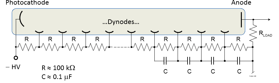 Die Fotokathode erhält eine negative Hochspannung (-HV); sie liegt bei etwa -500 bis -1500 V. Die Anode ist über den Lastwiderstand RLOAD mit Null verbunden. Bei gepulsten oder hochfrequenten Messungen ist RLOAD=50 Ω; andernfalls können für größere Sgnalspannungen höhere Werte genutzt werden. Die Dynoden erhalten ihre Spannungen durch eine Widerstandskette; in diesem Beispiel sind die Spannungen zwischen den Dynoden wegen der identischen Widerstandswerte gleich.