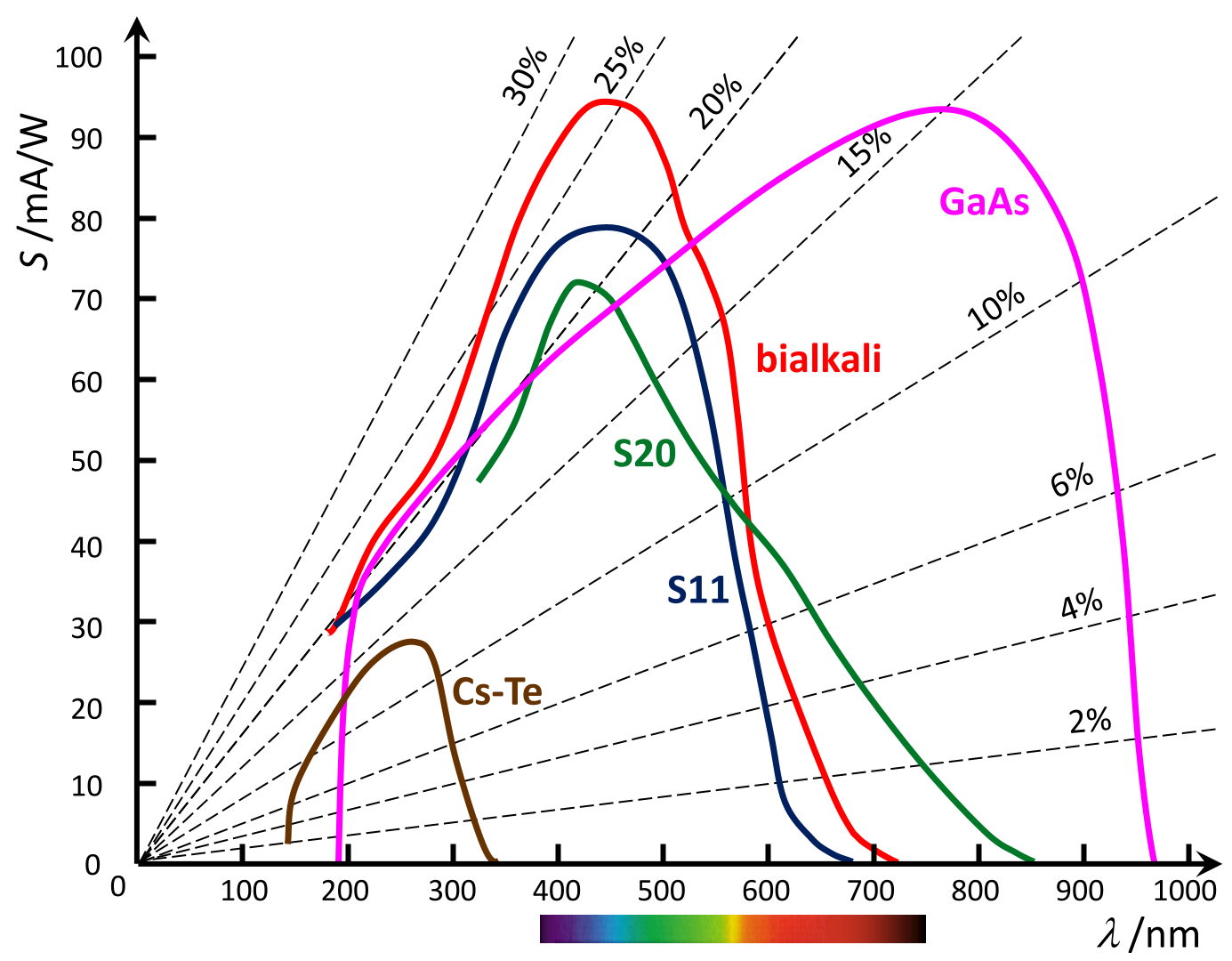 Es gibt eine große Zahl unterschiedlicher spekraler Empfindlichkeiten der Fotokathoden. Die für Vakuum-Fotodioden genannten Eigenschaften gelten hier in gleicher Weise. Die folgende Abbildung zeigt einige häufig genutzte Empfindlichkeiten.