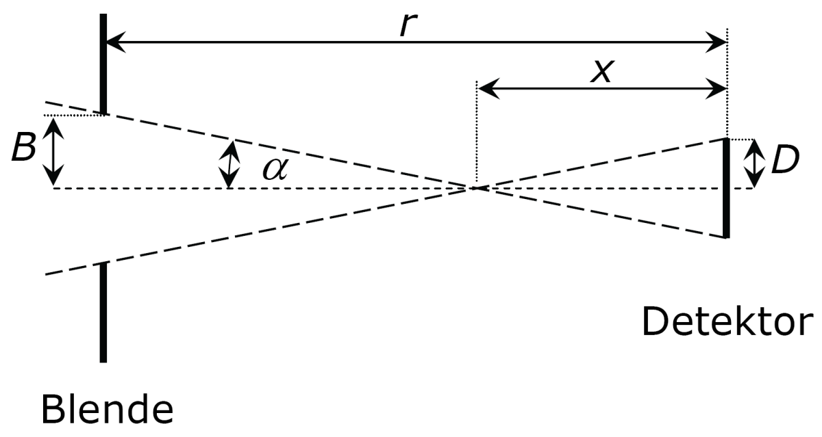 Detektor und Blende sind im Abstand r angeordnet. Der Radius des Detektors ist D, der Radius der Blende ist B. ist der größtmögliche halbe Gesichtsfeldwinkel.