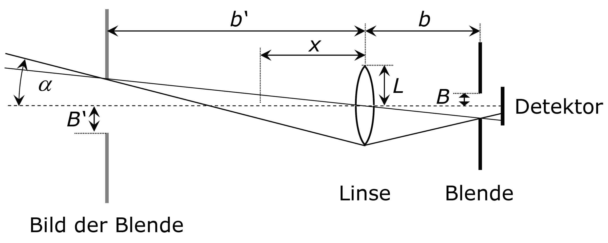 Der maximale Empfangswinkel wird durch die Linse (mit Radius L und Brennweite f) und die Blende im Abstand b festgelegt. Die empfindliche Fläche des Detektors hinter der Blende sei so groß gewählt, dass sie den Strahlengang nicht begrenzt. Der größtmögliche halbe Gesichtsfeldwinkel ergibt sich aus dem Bild der Blende B' im Abstand b' von der Linse.