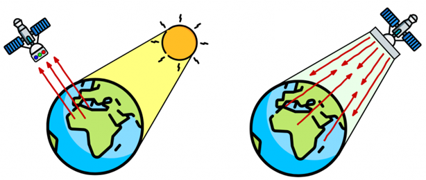 Друга възможност за разграничаване на спътниците за наблюдение на Земята е сравнението на използваните инструменти. Най-общо, има пасивни датчици, които измерват отразената слънчева светлина или топлинната радиация, и активни датчици, които използват собствен източник на излъчване/радиация.